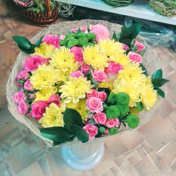 ЛЮКС: роза розовая (аква) - 5 шт, роза кустовая розовая - 6 шт, хризантема кустовая белая - 3 шт, хризантема кустовая зеленая(возможна замена на ромашковидную окрашенную) - 2 шт, хризантема одноголовая желтая - 4 шт, рускус, натуральная упаковка, желтый бант.Примерный диаметр букета 40х40 см.