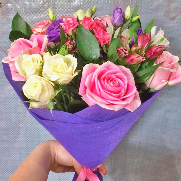 роза розовая - 5 шт, роза кустовая розовая - 1 шт, роза кустовая белая - 1 шт, фрезия(альстромерия) фиолетовая - 2 шт, фрезия(альстромерия) белая - 1 шт, эустома белая - 2 шт, декоративная зелень, фетр фиолетовый. Примерный размер: 25Х25 см.