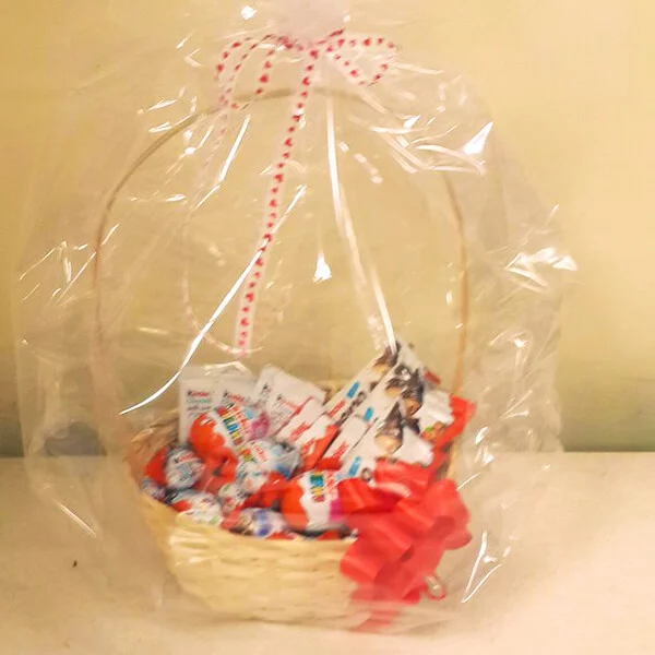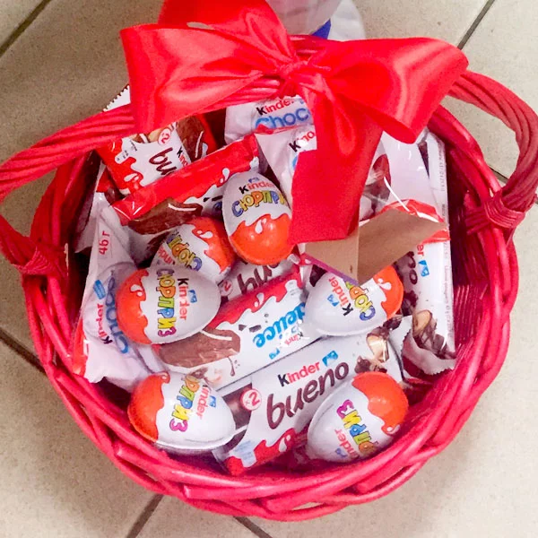 Уменьшенный: Kinder Сюрприз (яйцо) - 5 шт., Kinder Bueno - 3 шт., Kinder chocolate (шоколад молочный в упаковке) - 8 шт., Kinder chocolate со злаками - 3 шт., kinder schoko bons - (125г) 1 уп., корзина малая, лента красная, бант красный.