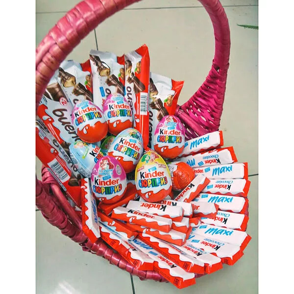Стандартный: Kinder Сюрприз (яйцо) - 6 шт., Kinder Bueno - 4 шт., Kinder chocolate (шоколад молочный в упаковке) - 8 шт., Kinder chocolate со злаками - 4 шт., kinder schoko bons - (125г) 1 уп., корзина средняя, лента красная, бант красный.