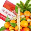 Стандартный: коробка конфет "Родные Просторы" (278 г.) - 1 шт., мандарины - 2 кг, набор конфет Ferrero Rocher (200г) - 1шт., зелень, еловая ветвь - 1 шт., сетка красная, корзина средняя.
