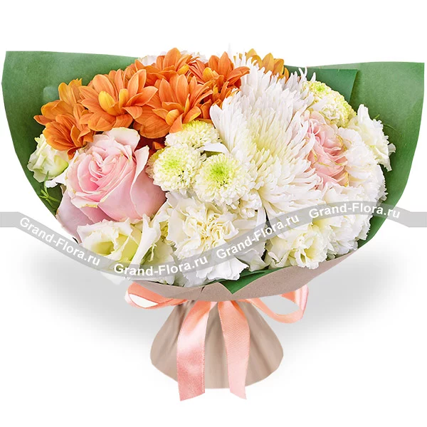 Стандартный: роза розовая - 4 шт., хризантема кустовая оранжевая - 2 шт., эустома белая - 2 шт., хризантема одноголовая белая - 2 шт., хризантема белая кустовая - 2 шт., гвоздика белая - 3 шт., упаковка, лента. Примерный размер: 35 х 45 см.