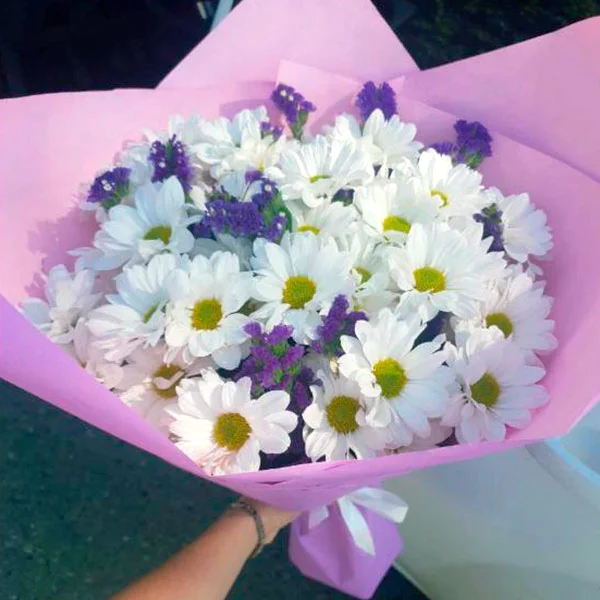 Искал букет с ромашками, нигде не мог найти. Когда позвонил в службу, мне пояснили, что в это время года ромашка не поступает в магазины, но кустовые хризантемы ничем не отличаются от ромашки. Выбрал этот букет в люксовом варианте, смотрится очень достойно. Рекомендую.
