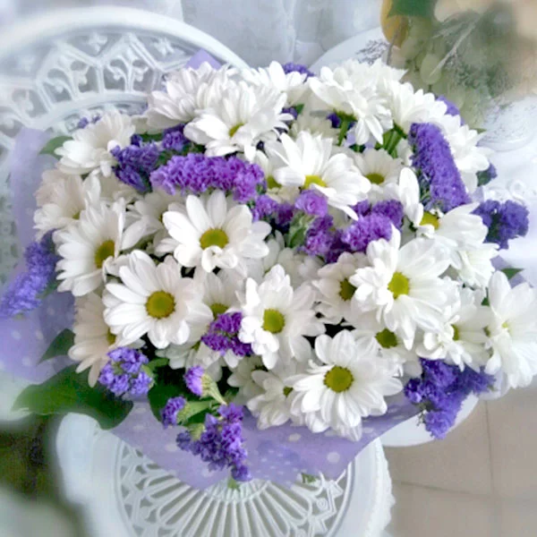 хризантема белая кустовая ромашковая - 15 шт., статица - 8 шт., салал, фетр фиолетовый.  Примерный размер: 40Х40 см.