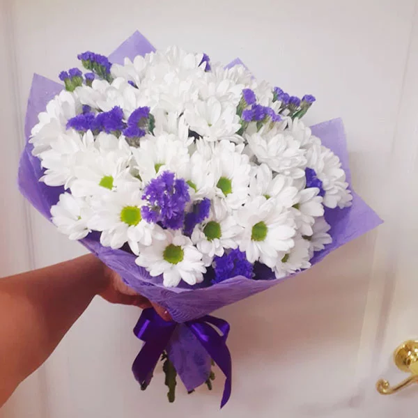 хризантема белая кустовая ромашковая - 7 ., статица - 3 шт., салал, фетр фиолетовый. Примерный размер: 25Х30 см. Данный букет представлен на фото